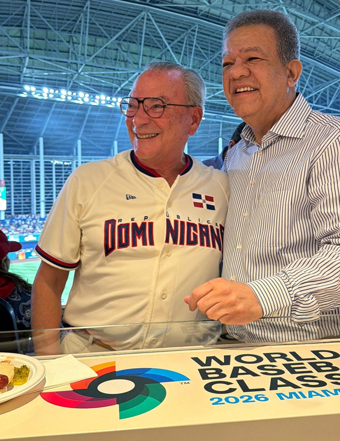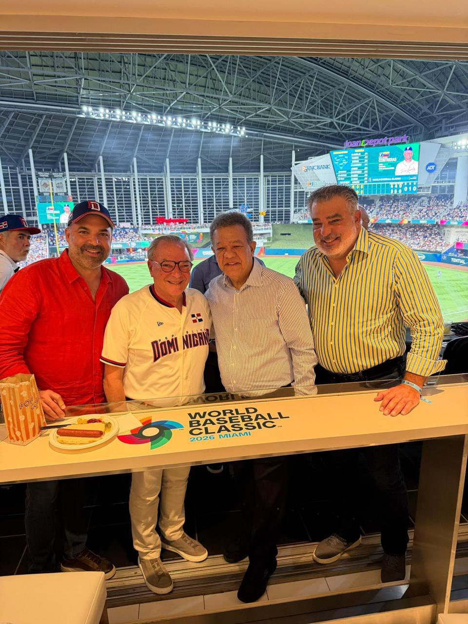 El expresidente dominicano Leonel Fernández, el fundador del Grupo Puntacana, Frank Rainieri y el ministro de Turismo David Collado, protagonizaron un momento de cordialidad al compartir un abrazo durante el partido entre República Dominicana y Venezuela del Clásico Mundial de Béisbol 2026, celebrado en el loanDepot Park de Miami.
